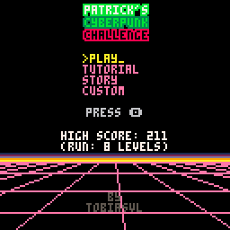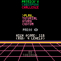 The title screen also has a vaporwave-style scrolling pink grid horizon, since the jam's theme was "cyberpunk" and the game consists of grids. I made the grid in a few minutes, without knowing much about PICO-8, and it looked like actual garbage.